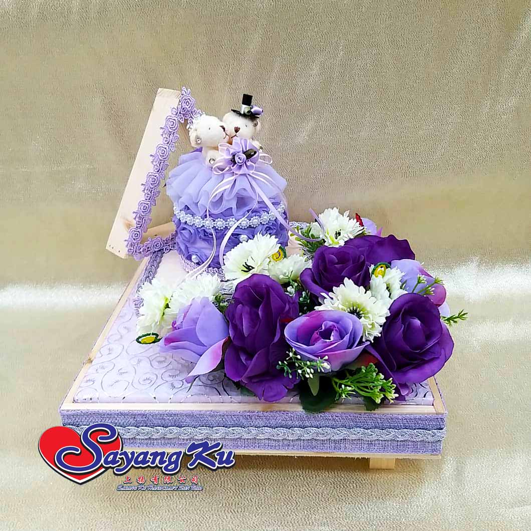 - Letakkan gabus yang siap dibalut dengan kain organza yang bercorak di dalam gulang kayu siap dihias dengan reben guni dan renda yang berwarna ungu.